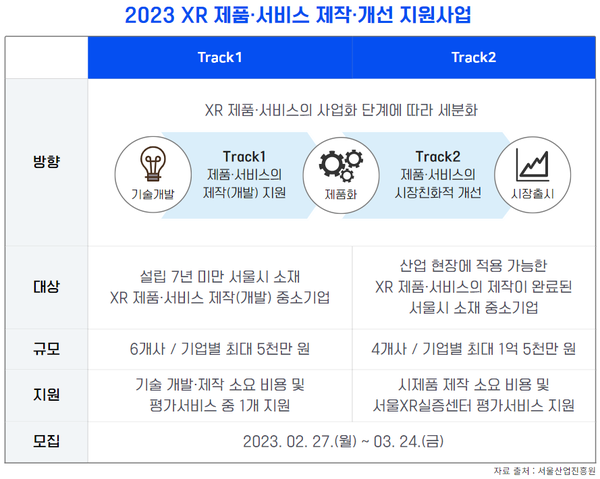 총 9억 원 규모로 조성된 이번 사업은 서울시 소재 XR 및 메타버스 분야 유망 스타트업·중소기업을 대상으로 산업현장(교육·안전·의료 등)에 적용 가능한 XR 제품·서비스의 제작 및 개선을 지원한다. 사업화 단계에 따라 △시제품 제작 및 개발 단계의 중소기업을 대상으로 경쟁력 있는 상품을 완성하도록 지원하는 'Track1' △시제품 제작이 완료되어 시장 출시를 앞둔 중소기업의 시장경쟁력 향상을 돕는 'Track2'로 나뉘며 지원 대상 및 규모에 차이를 보인다.