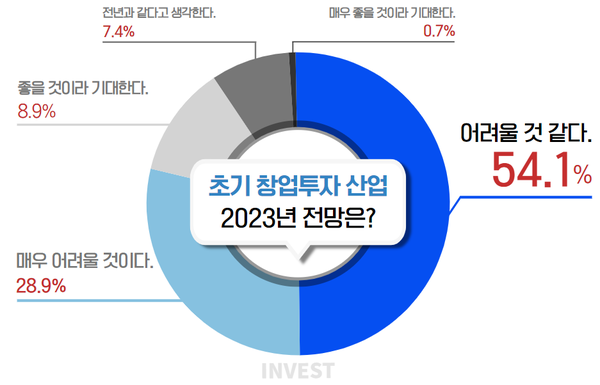 올해 1월 한국액셀러레이터협회가 국내 스타트업 액셀러레이터(AC, 창업기획자) 375개사를 대상으로 진행한 설문 결과에 따르면, 2023년 초기 창업투자 산업이 어려울 것이라고 전망한 응답자가 83%(112명)에 달하는 것으로 집계됐다. 반면 전망이 좋을 것이라고 응답한 AC는 9.6%(13명), 전년과 같을 것이라는 응답은 7.4%(10명)에 그쳤다.