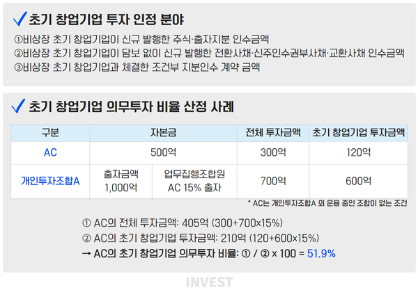 AC는 스타트업에 대한 전문 보육·투자 등을 수행하는 기관으로, 법인 등록일로부터 3년이 되는 시점까지 전체 투자 금액 대비 '초기 창업기업 의무투자 비율'이 40% 이상이어야 한다. 「벤처투자법」에서 정의하는 초기 창업기업은 사업 개시일로부터 3년 미만의 법인 또는 개인사업자 중소기업으로, 전체 투자금액이 300억 원인 AC라면 이 중 120억 원을 초기 창업기업에게 투자해야 한다는 뜻이다. 더불어 AC가 운용하는 개인투자조합이라면 의무투자 비율은 50% 이상까지 높아진다.
