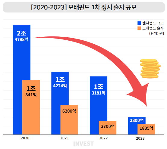 이에 더해 정부의 모태펀드 예산은 나날이 줄어들고 있다. 지난 1월 4일 중소벤처기업부는 모태펀드 예산 3135억 원 중 1835억 원을 출자해 2800억 원 규모의 벤처펀드를 조성하겠다는 내용이 담긴 '모태펀드 2023년 1차 정시 출자 공고'를 발표한 바 있다.