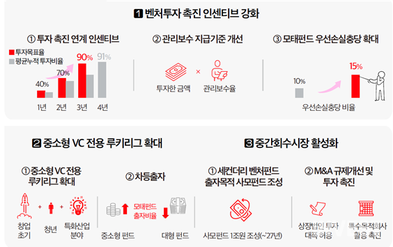 구체적으로 투자 목표율을 달성한 벤처펀드 운용사(정부 모태펀드의 출자를 받아 결성한 모태자펀드 운용사)에게 관리보수를 추가 지급하고, 모태펀드 출자사업 선정 시 가점 부여 인센티브를 제공한다. 또한 출자자 모집이 어려운 신생 또는 중소형 벤처캐피탈 전용 모태펀드인 '루키리그'를 확대하고 모태펀드 정책 출자 비율에서 중소형 펀드의 비율을 높일 예정이다. 루키리그는 등록 3년 이내, 운용자산 500억 원 미만의 벤처캐피탈만 참여할 수 있도록 조성된 모태펀드 출자 분야를 일컫는다.