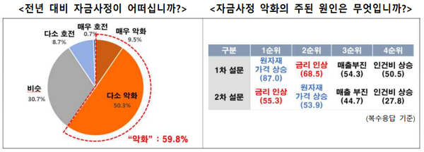 먼저, 자금 사정 현황에 대한 질문에 응답자의 59.8%가 전년 대비 자금 사정이 악화됐다고 답변했다. 이는 1차 조사(45.7%) 대비 약 14% 증가한 수치로, 최근 들어 기업의 금융 환경이 보다 어려워졌음을 시사하고 있다. 특히 CEO의 '자금 사정 악화' 응답비율은 전체 평균을 상회하는 73.5%로 나타나, 기업을 직접 경영하는 이들이 느끼는 금융 애로가 실무자보다 크다는 것을 알 수 있었다.