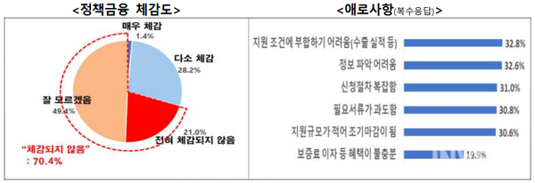 정책금융 체감도를 묻는 질문에 응답자의 70.4%가 체감되지 않는다고 답했으며 지원조건의 높은 문턱, 정보 파악의 어려움, 복잡한 신청 절차 등이 주요 원인으로 꼽혔다. 특히 과다한 서류 요구, 기관별로 산재해 있는 정보 파악의 어려움 등 정책금융 전달 체계와 관련된 업계 애로사항이 높았는데, 이는 중소기업의 경우 인력 부족으로 이와 같은 행정업무의 부담이 가중되고 있기 때문이다.