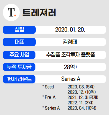 2020년 1월 설립된 트레져러는 희소가치가 높은 상품(명품 시계·가방, 고급 와인·위스키 등)에 최소 1,000원 단위부터 분할 투자할 수 있도록 지원하는 조각투자 플랫폼을 운영하고 있다. 투자자들은 희망하는 물품의 소유권 지분을 원하는 만큼 매입할 수 있으며, 추후 매입가보다 더 높은 가격에 물품이 판매될 경우 수수료를 제외한 원금 및 수익금을 확보할 수 있다. 현재 트레져러는 총 138개의 블루칩 상품을 조각 모집 중이며 이 중 58개 상품은 매각이 완료된 것으로 알려졌다.