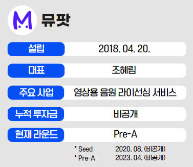 2018년 4월 설립된 뮤팟은 저작권 문제가 없는 영상소스 구독 서비스를 운영하는 콘텐츠 IP 스타트업이다. 유튜브를 비롯해 여러 플랫폼의 각기 다른 저작권 규정으로 어려움을 겪는 크리에이터를 돕는 데 목표를 둔다.
