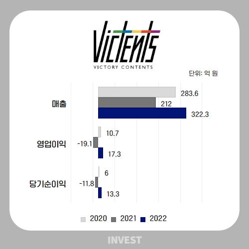 이후 빅텐츠는 대주주인 F&F의 자금력에 힘입어 부채비율을 낮추는 등 재무구조 개선에 나섰다. 지난해 매출액은 전년 대비 52% 증가한 322.3억 원을 달성했으며 영업이익은 17.3억 원, 당기순이익은 13.3억 원으로 흑자 전환에 성공했다.
