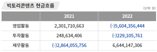빅텐츠의 2022년 영업활동 현금흐름은 -56억 원으로 전년 순유입에서 순유출로 전환됐다. 이는 영업활동으로 인해 회사의 부채가 증가했음을 의미하는 것으로, 당기순이익은 흑자로 전환됐지만 매출채권이 급격하게 증가한 영향이다. 빅텐츠의 매출채권은 2021년 4억 원에서 2022년 71억 원으로 67억 원 증가했다. 해당 매출채권은 지난해 방영 작품에 대한 장기회수 조건이 붙어있어 향후 회사 유동성 확보 차원의 자금조달 방안이 필요할 것으로 분석된다.