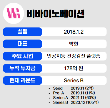이번 라운드에는 기존 투자사인 AI엔젤클럽이 후속 투자자로 참여했으며 UTC인베스트먼트, 이앤인베스트먼트, 신한벤처투자, 현대해상화재보험, MMS벤처스가 신규 투자사로 나섰다. 이로써 비바이노베이션은 현재까지 총 178억 원의 누적 투자금액을 달성했다.