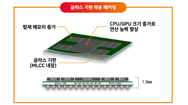 유리 기판은 실리콘보다 낮은 제조원가, 유기보다 뛰어난 내열성과 절연성, 높은 평탄도와 기계적 강도 등의 장점을 갖고 있어 AI 반도체의 대면적화에 적합하며, 많은 칩을 탑재해도 변형 우려가 적다.