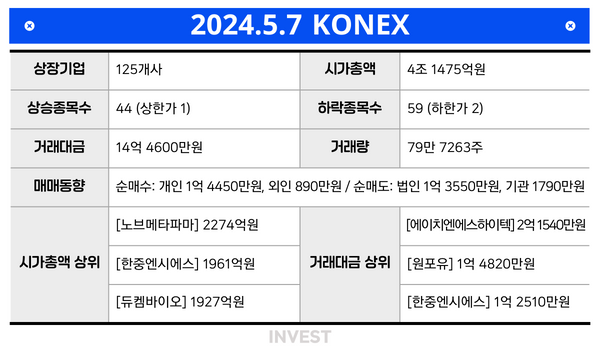 5월 7일 코넥스 시장의 상장기업은 총 125개사다. 시가총액은 전일 대비 429억 원 감소한 4조 1,475억 원으로 집계됐으며 시가총액 상위 기업은 노브메타파마가 2,274억 원으로 1위, 한중엔시에스가 1,961억 원으로 2위, 듀켐바이오가 1,927억 원으로 3위다.