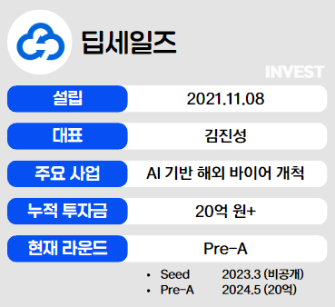 2021년 11월에 설립된 딥세일즈는 인공지능(AI)을 기반으로 잠재 바이어 발굴 서비스를 제공하는 기업이다. AI 프로세스 자동화를 통해 거래 성사 확률이 높은 잠재 바이어의 데이터(기업, 위치, 담당자 이름, 이메일, 구매의도, 매칭 호환성 등)를 실시간으로 제공한다. 이를 통해 영업 담당자들이 신규 바이어를 발굴할 때 데이터 수집과 정리에 소요되는 시간을 줄이고, 세일즈 활동에 보다 많은 시간을 투자할 수 있도록 돕는다.