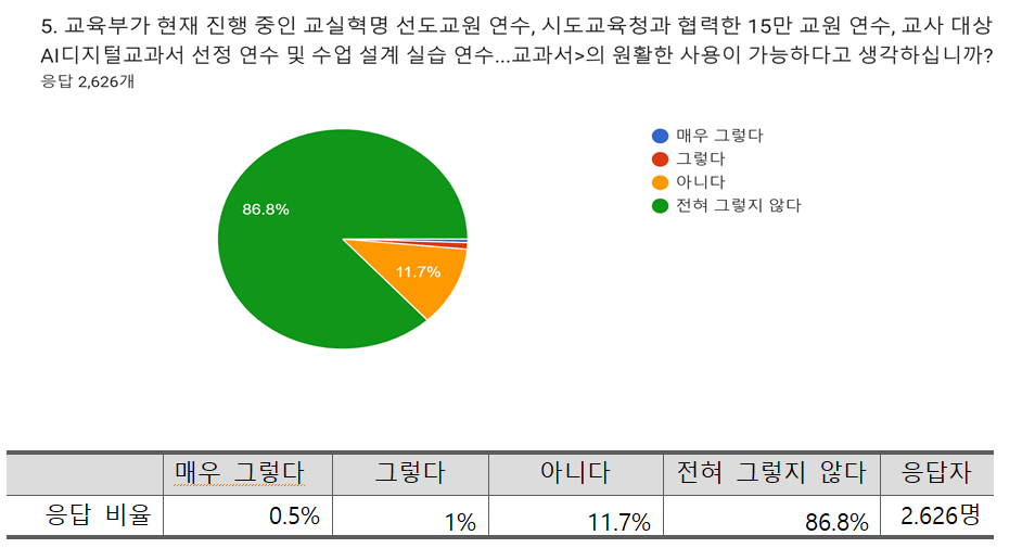 이에 대해 전교조는 "디지털교과서의 실물 공개가 지연돼 교사 대상 연수가 매우 미흡한 수준으로 이뤄졌고, 실제 사용과 관련된 연수는 전무했다는 의견이 대부분이었다"라고 설명했다.
