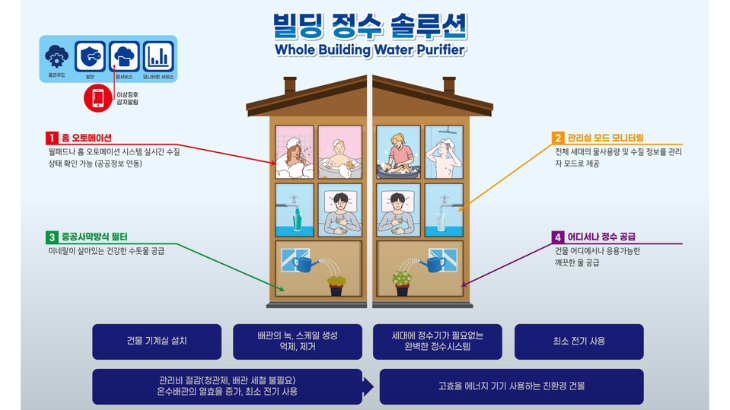 특히 회사는 국내 최초로 '빌딩 정수'라는 개념을 상용화해 스마트 빌딩 정수 플랜트 '블로스'(BLOS, Building Oasis)를 개발했다. 블로스는 건물 내 모든 수도꼭지에서 직접 음용 가능한 물을 공급하는 혁신적인 솔루션으로, 기존 배관의 교체 없이 살균·녹·스케일 제거가 가능하다. 또한 AI 기반 실시간 모니터링 시스템(지오리더)을 통해 분 단위로 수질을 검측하고 구체적인 데이터를 제시한다.